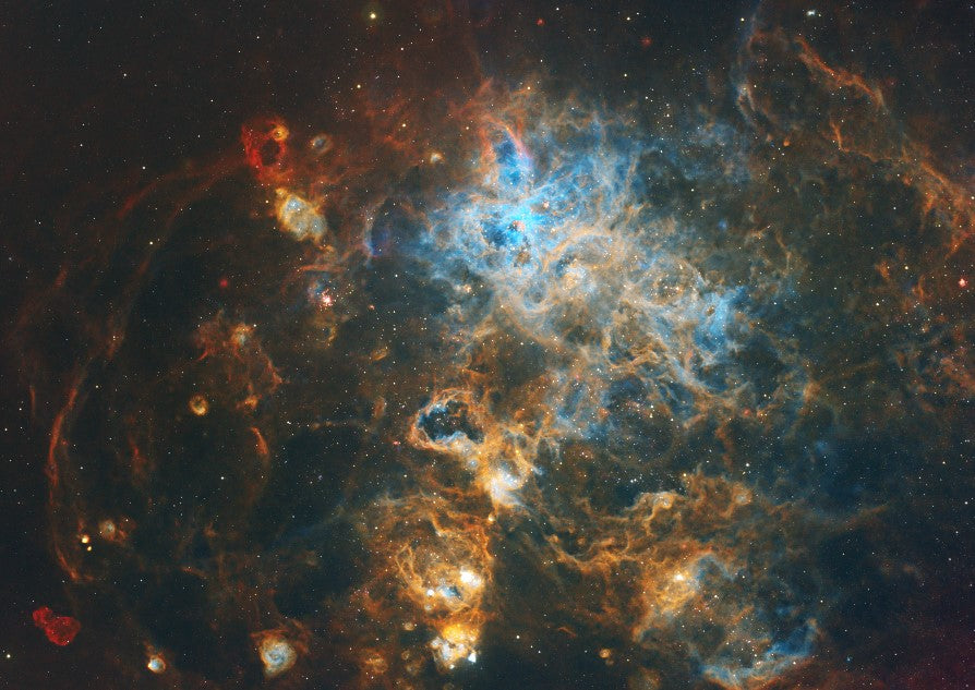 Fun Fact: If the Tarantula Nebula was at the same distance as the famous Orion Nebula (1500 light years) it would be 75 full Moons wide! It would stretch from the horizon to nearly halfway to being overhead and it would cast noticeable shadows here on Earth!